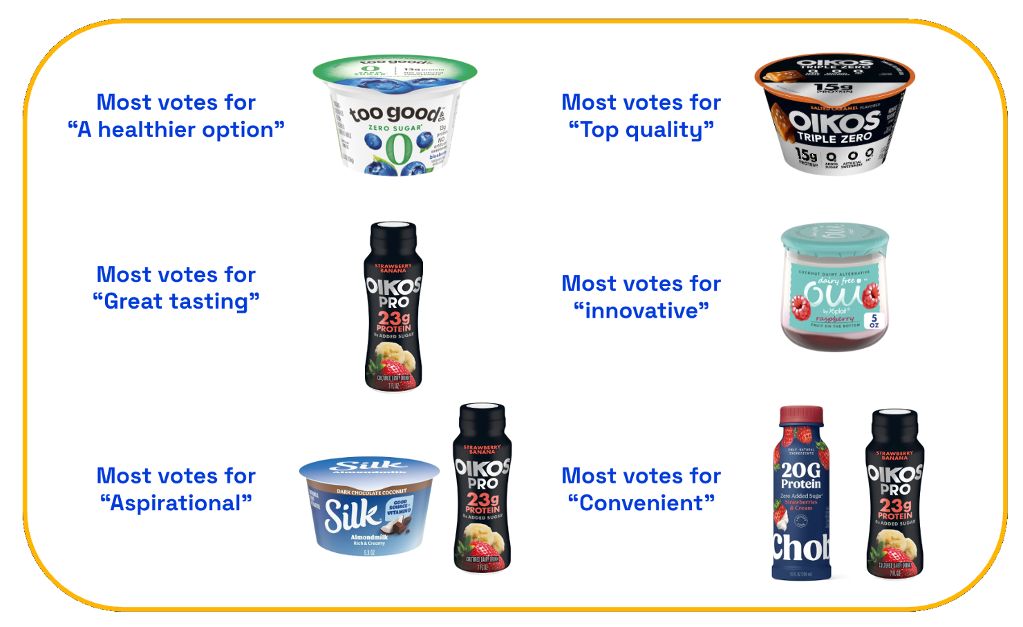 On-the-go is a key occasion for yogurt: No longer just a breakfast food, yogurt has a number of different occasions for consumption, including on-the-go. 40% of consumers say they are likely to buy yogurt for eating on the go, which is much higher than we expected. With this in mind, combined with the importance of protein in the previous takeaway, it’s no wonder the Oikos and Chobani yogurt protein drinks took the top two spots in our ranking!