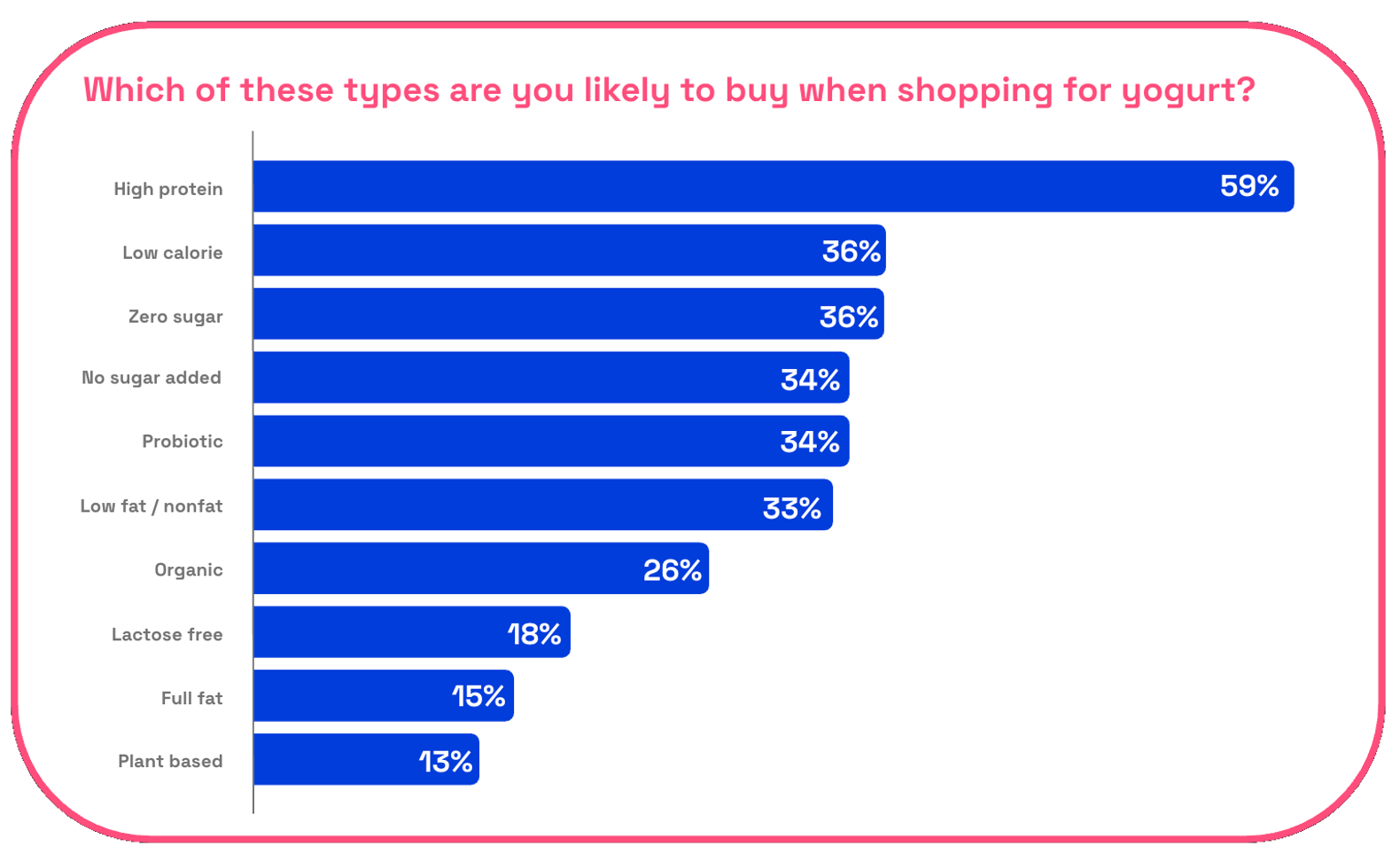 And when we asked specifically which claims are more likely to appeal to respondents as they’re shopping for yogurt, “high protein” came out way at the top with 59% saying they were likely to purchase.