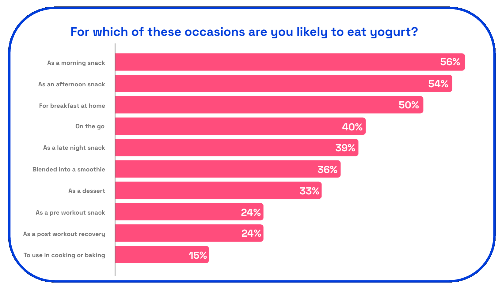 We were a bit surprised with both of the protein drink options ranking so high in our analysis, so we asked respondents which occasions they’re likely to eat yogurt. Morning and afternoon snacks topped the list, with traditional yogurt occasion breakfast falling below that.