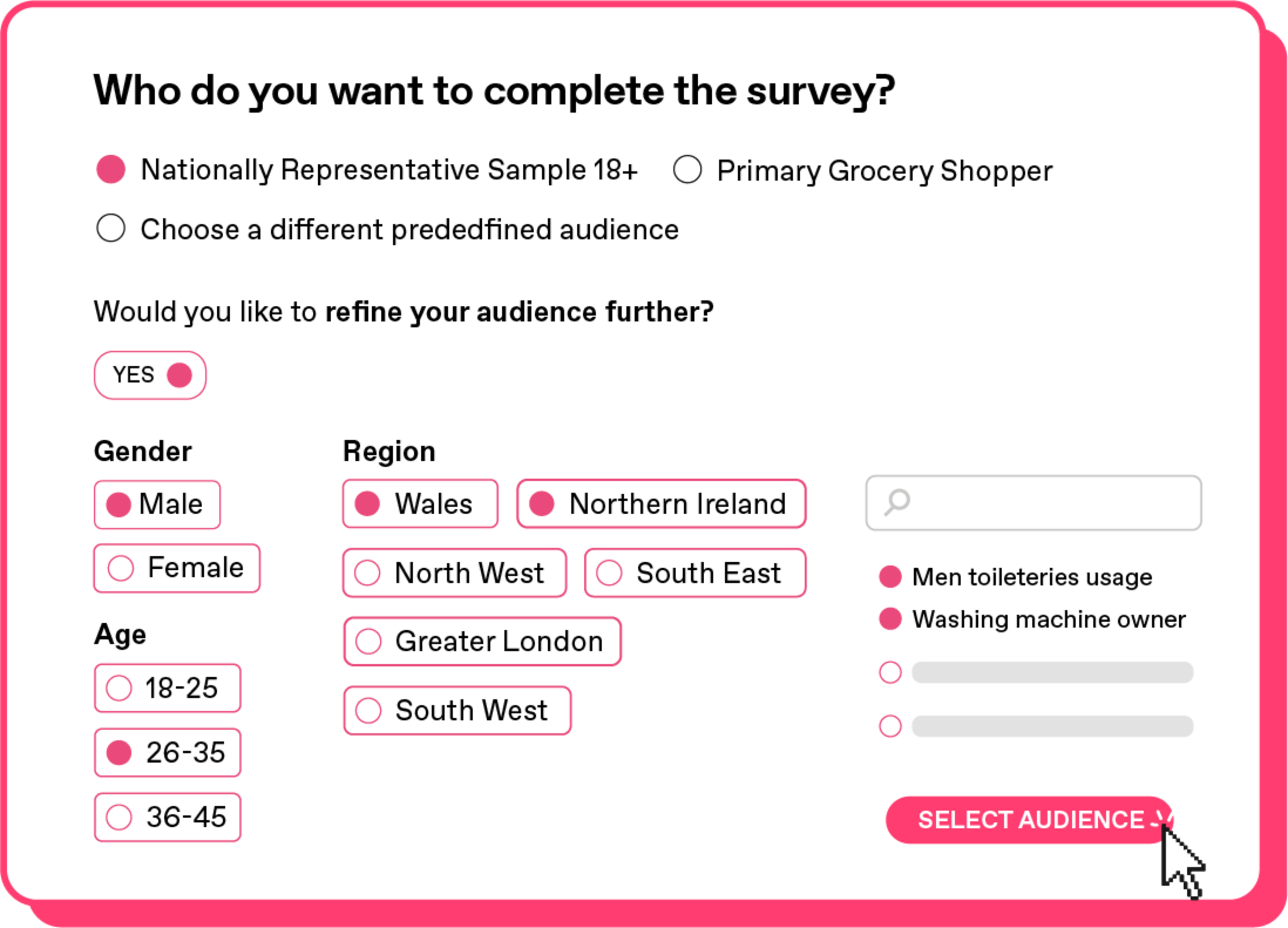 We believe in surveying to a broad category audience so you can truly understand how to grow your brand and robustly compare against our benchmarks. We have over 70 categories in 30 countries already set up and ready for you to use. You can also deep-dive on critical sub groups and key interest areas so we make it easy for you to filter your data and boost responses of those you're most interested in.