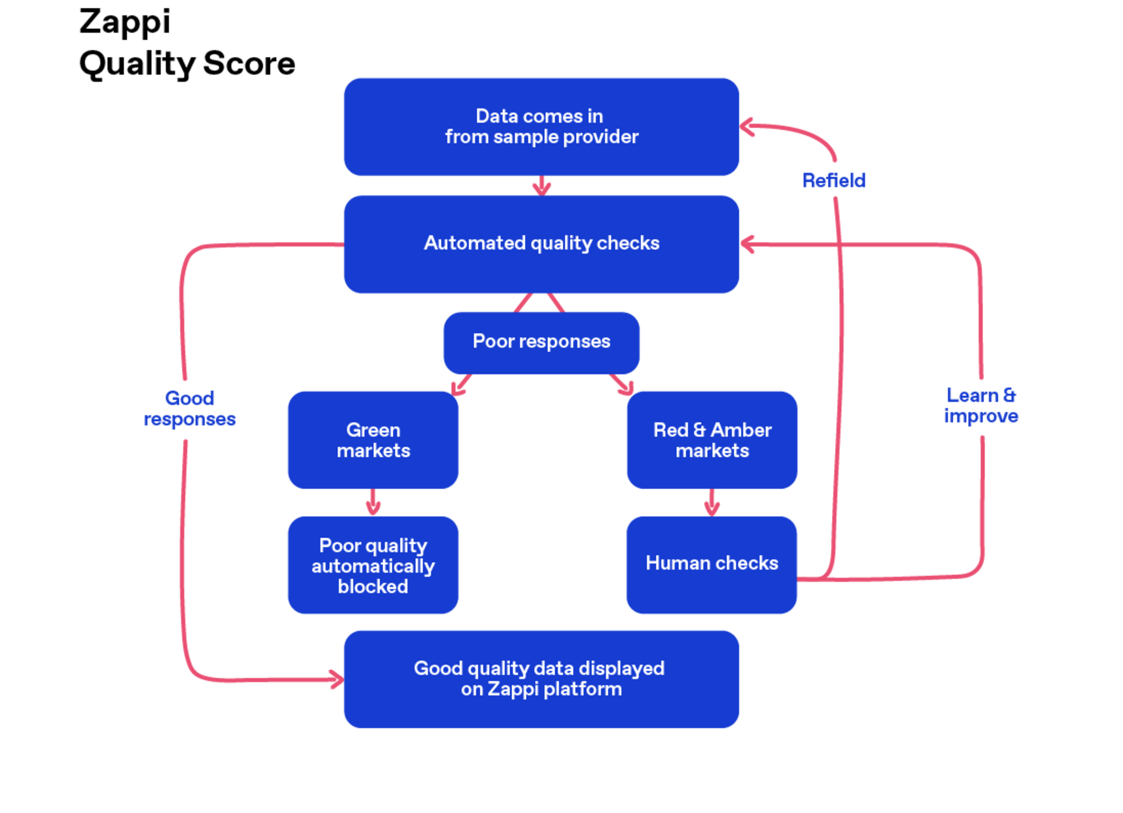 The Zappi quality score looks at 14 signals of quality at an individual respondent level and creates a composite score. We continuously assess and enhance data quality by monitoring the quality score across respondents and research projects.